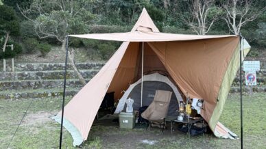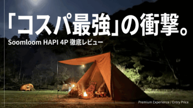 Soomloom HAPI 4Pを実際のキャンプ目線でレビュー。TC素材のメリット、室内の広さ、設営のしやすさ、注意点までわかりやすく解説。ファミリー・デュオ向けのワンポールテント選びに役立つ内容です。