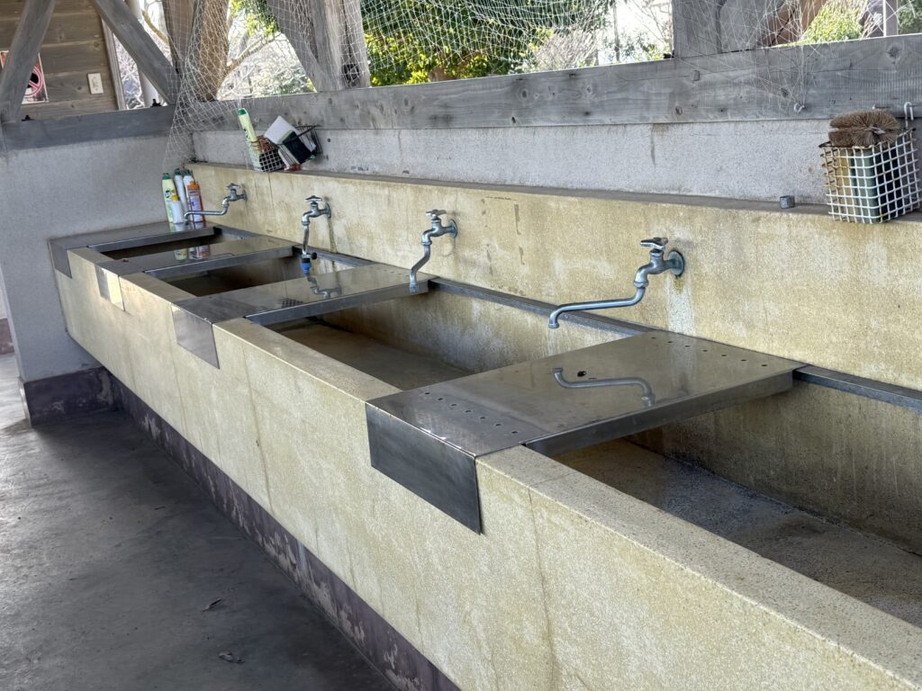 炊事棟は水場・調理用テーブルがあり、設備面はしっかりしています。