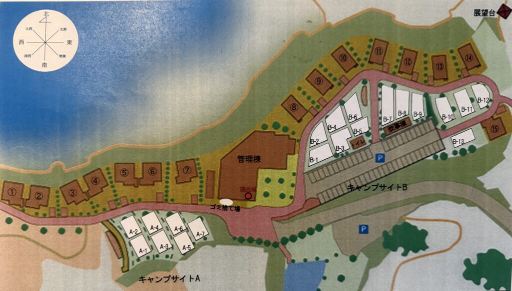 受付時にサイトを選べる仕組みなので、少し早めに到着して、実際にサイトを見てから受付するのがおすすめです。サイトごとに雰囲気が違うため、景色重視か、風対策重視かで選び方が変わります。