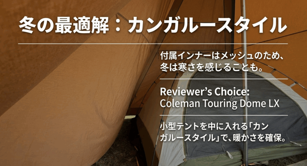 冬は付属のメッシュインナーテントより、コールマンツーリングドームLXのインナーテントをカンガルーで使っています。