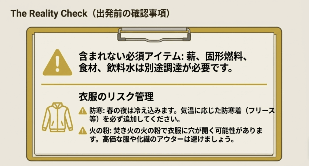• 焚き火中は火の粉が飛ぶことがあるので、テントや服に穴が開く場合があります。いい服は着ていかないようにしましょう。