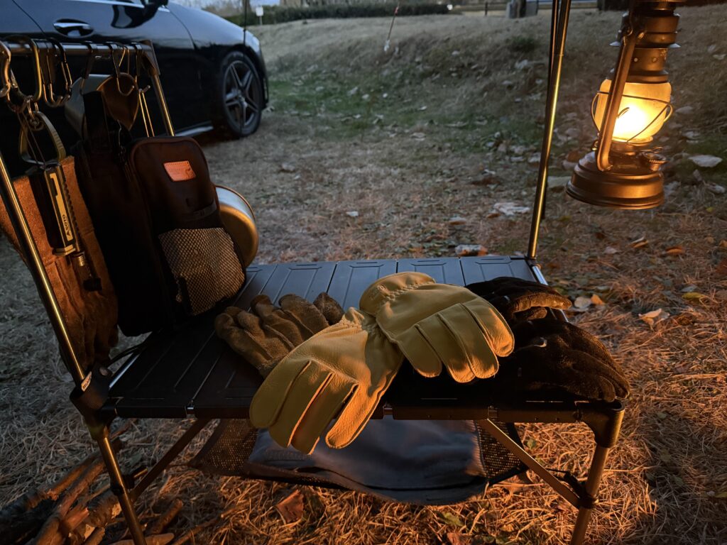 焚き火の薪をつかむとき、熱々のダッチオーブンを持つとき、このG-1があれば安心感が違います。特に印象的なのは革の質感。最初はややしっかりした硬さがありますが、使い込むほどに柔らかくなり、自分の手の形に馴染んでいきます。