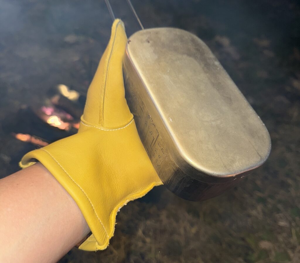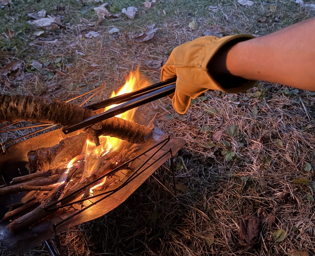🔥 焚き火作業:薪をくべたり、熱い鍋を持つときに