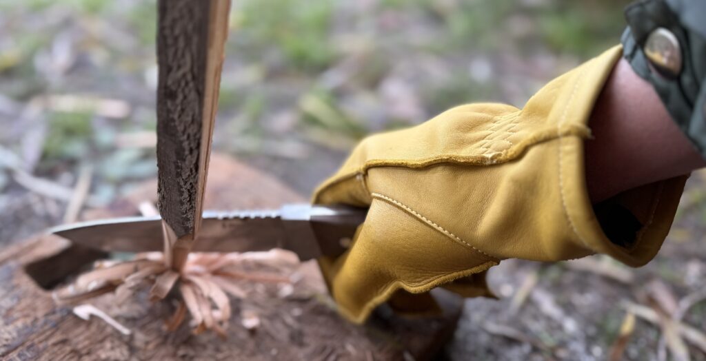 外縫い仕様なので内側がフラットで、長時間着用しても違和感がありません。細かなナイフワークも問題なくこなせますし、薪割りのような力仕事でもしっかりグリップできます。