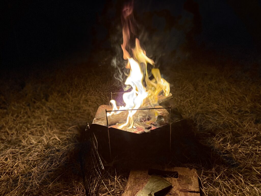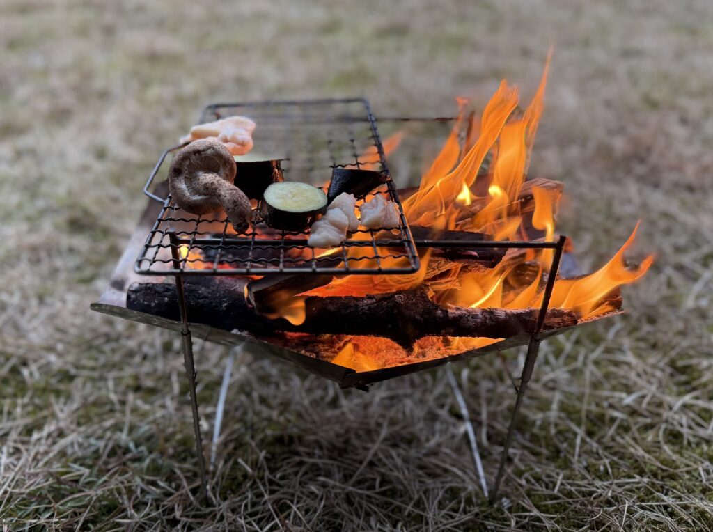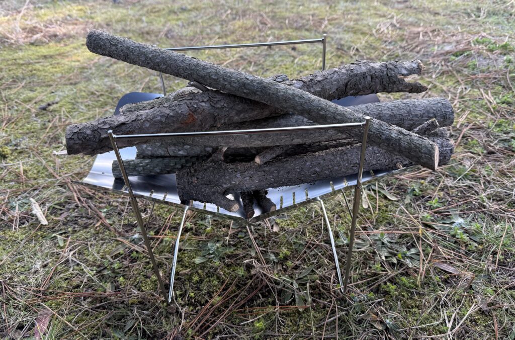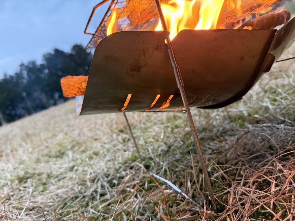 細身のフレームを見て「こんなので大丈夫?」と思う方も多いはず。私も最初はそう思いました。でも実際にはフルサイズの重い広葉樹薪を乗せ、さらにクッカーを置いても全く問題なし。ステンレスの強度と構造的な安定感が、見た目の心配を裏切ってくれます。