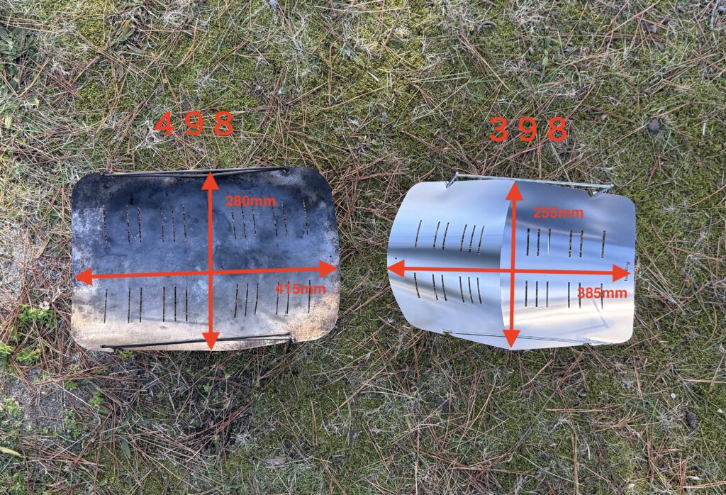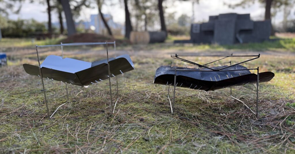焚き火そのものを楽しみたい人・軽さを最優先したい人 には398がベスト。シンプルに薪を燃やして炎を眺める、ソロ焚き火の王道を楽しめます。バイクや徒歩キャンプなど、積載を極限まで減らしたい場面でも498より有利です。比べると、火床が高く芝ダメージは少なく、湾曲が大きく火床は狭い。