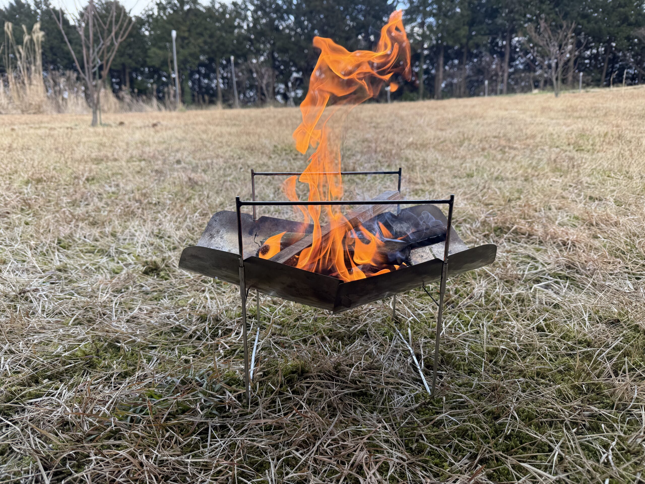 薄いステンレスのプレートとシンプルなフレームが組み合わさった佇まいは、正直「かっこいい」の一言。火を入れると、この華奢な鉄の枠の中で燃える炎が映えるんです。