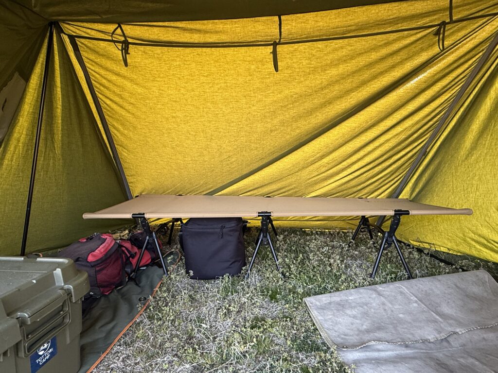 ▲ハイスタイルでテント内設置。コット下に荷物を収納でき、空間が整理しやすい。