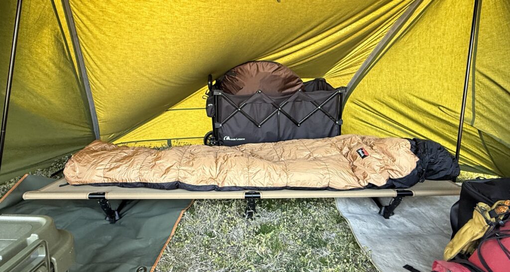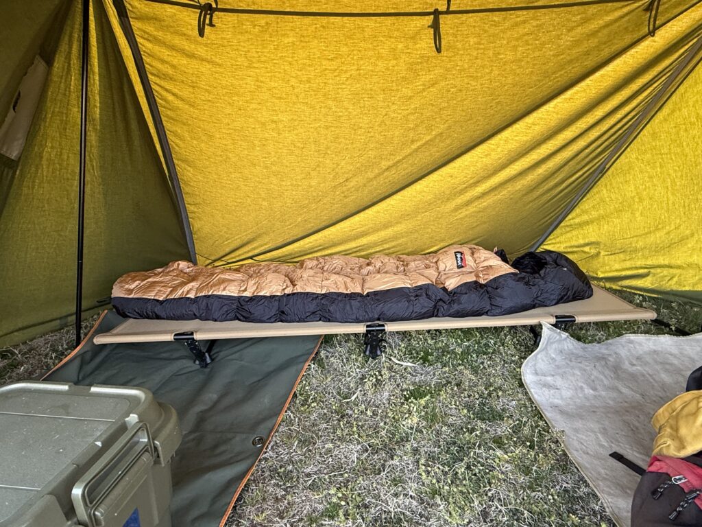 ▲ロースタイルに寝袋を乗せた状態。テント内でしっかり収まるサイズ感。